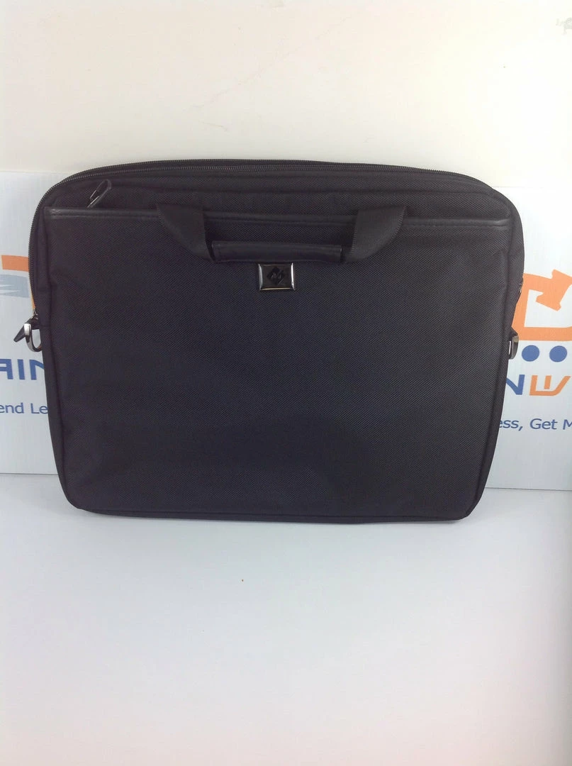 Fits a 15” laptop made of black nylon. Many pockets front and back with two large pockets for papers, books and cushioned pocket for laptop. Handles to make it easy to carry. Black. Inside dimension 16W” x 12H”