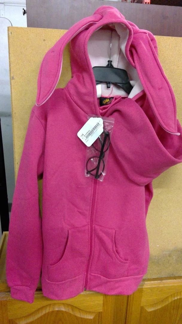 Ralphie may not have loved his bunny suit, but the rest of the world did! Give everyone a laugh in this Rasta Imposta bunny hoodie inspired from the timeless Christmas classic, A Christmas Story. Made from cotton and polyester, this soft pink hoodie features a front zipper and floppy pink ears on the hood. This funny hoodie is great for Christmas themed parties and other holiday events. Small