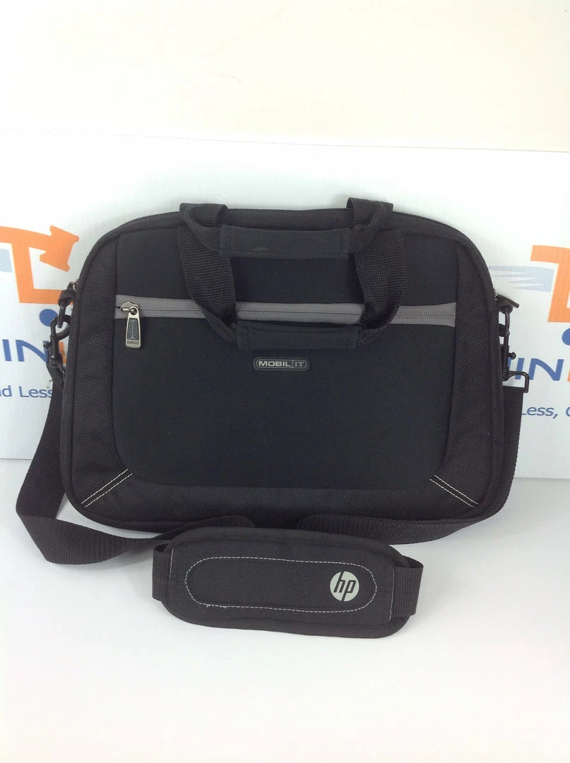 Fits a 12” laptop made of black nylon. Adjustable padded strap. Pockets front and back with two inside pockets for for small items.