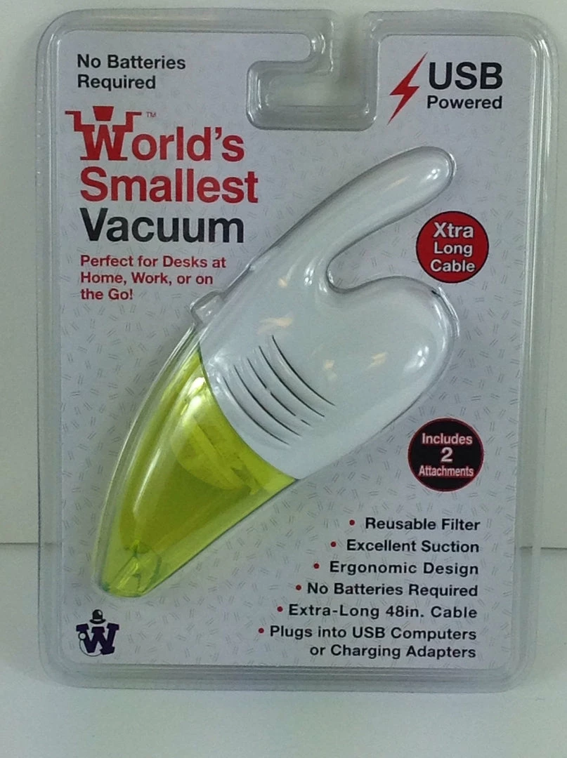 The World’s Smallest Westminster Vacuum, Random Color this micro vacuum is perfect for your desk, or even traveling in your car. The convenient 4ft USB cord easily plugs into computers and other USB power adapters allowing you plenty of room to operate. The good news is that batteries are not required. It also comes with a handy reusable filter. Don’t let the size fool you, our miniature vacuum has excellent suction and is ergonomically designed. 6″ X 2.25″.